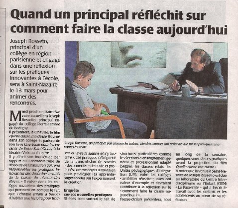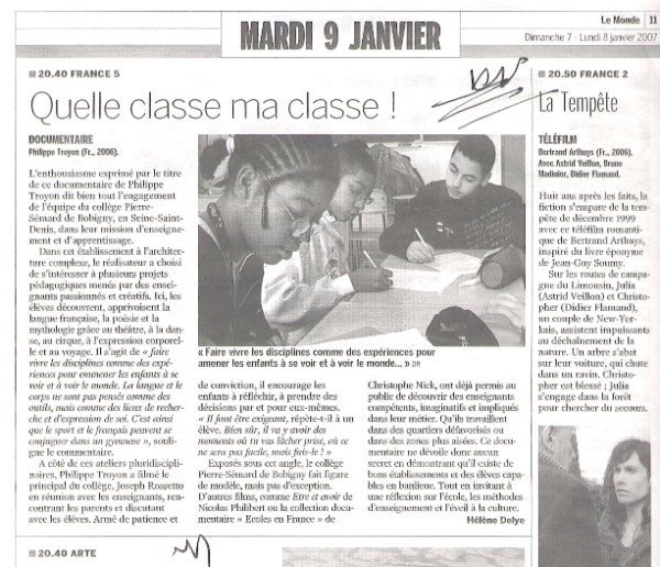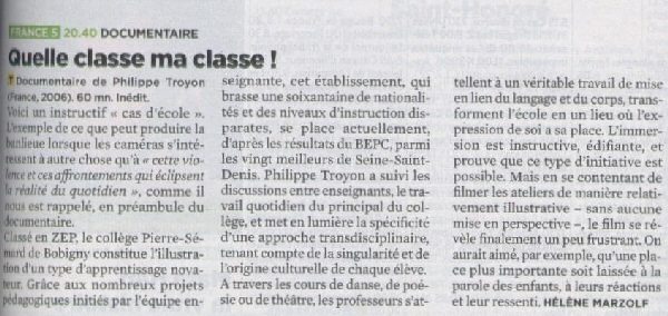 Documentaire de Philippe Troyon - France Télévision - France 5 - [60 ‘] - La classe de cinquième A du collège Pierre Sémard de Bobigny, mène depuis deux ans un projet de classe artistique qui invite les élèves, à travers la danse contemporaine et l’écriture poétique, à une création sur le thème du voyage. « L’école ne peut rien ouvrir si l’enfant n’y rencontre ni son désir, ni les moyens de créer quelque chose avec leurs mains, leurs corps et leurs têtes. Avant toute chose, ces voyages d’étude mettent les élèves dans une expérience, une recherche où les savoirs s’inscrivent dans des aventures authentiques »